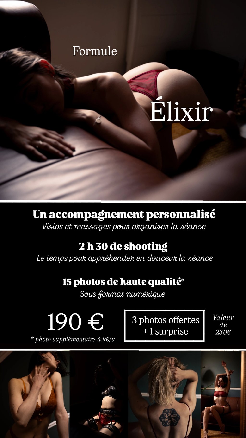 Lorsque j'ai débuté les shooting boudoir, j'ai vraiment pris conscience de l'impact positif que les séances peuvent produire chez les femmes que j'accompagne. Je suis particulièrement fière de pouvoir contribuer à leur bien-être en faisant évoluer le regard qu'elles portent sur leur corps. En l'espace de 2h - pour chacun des shooting que j'ai réalisé - j'ai été le témoin d'une véritable évolution entre le début et la fin de la séance.
